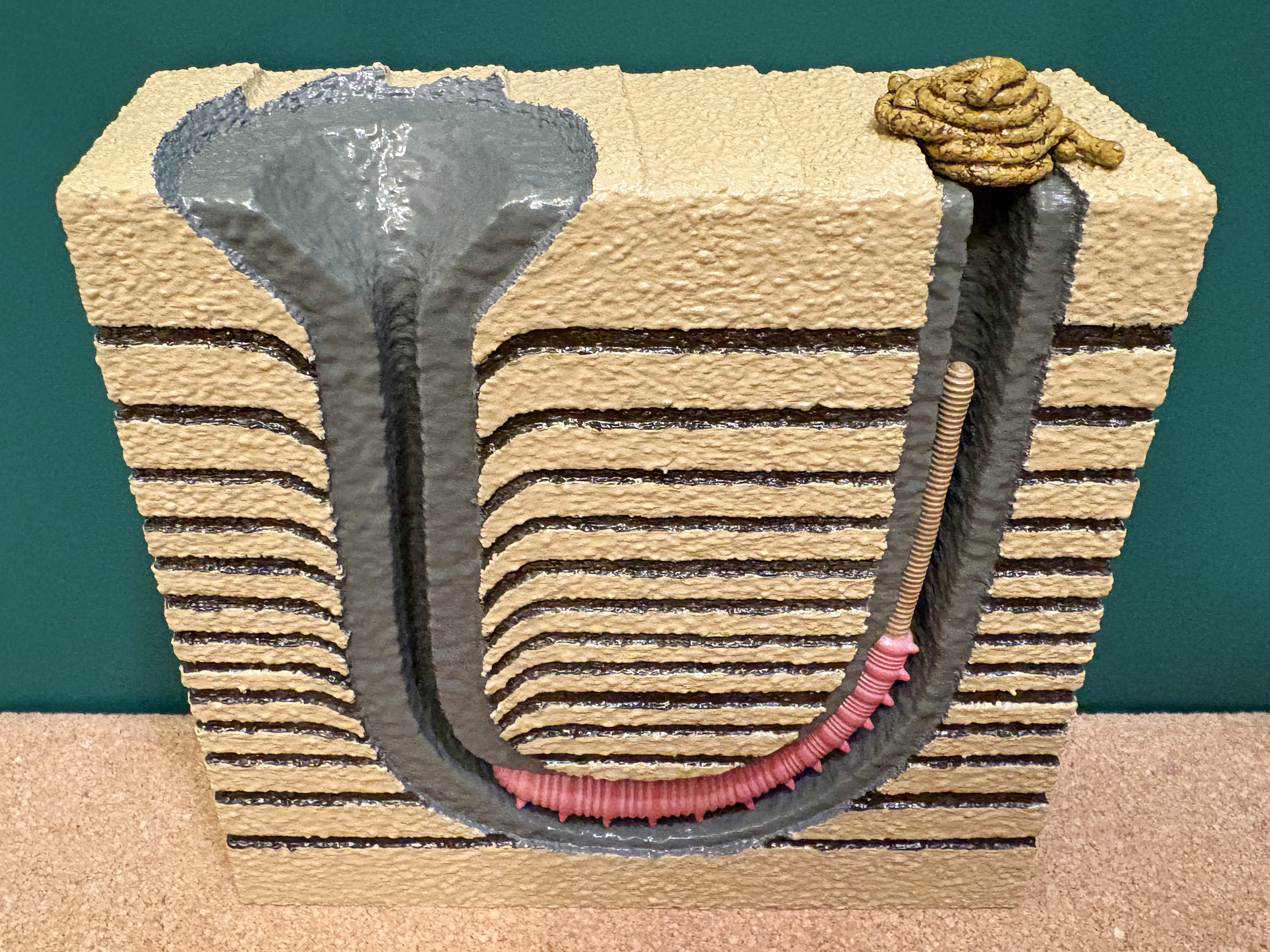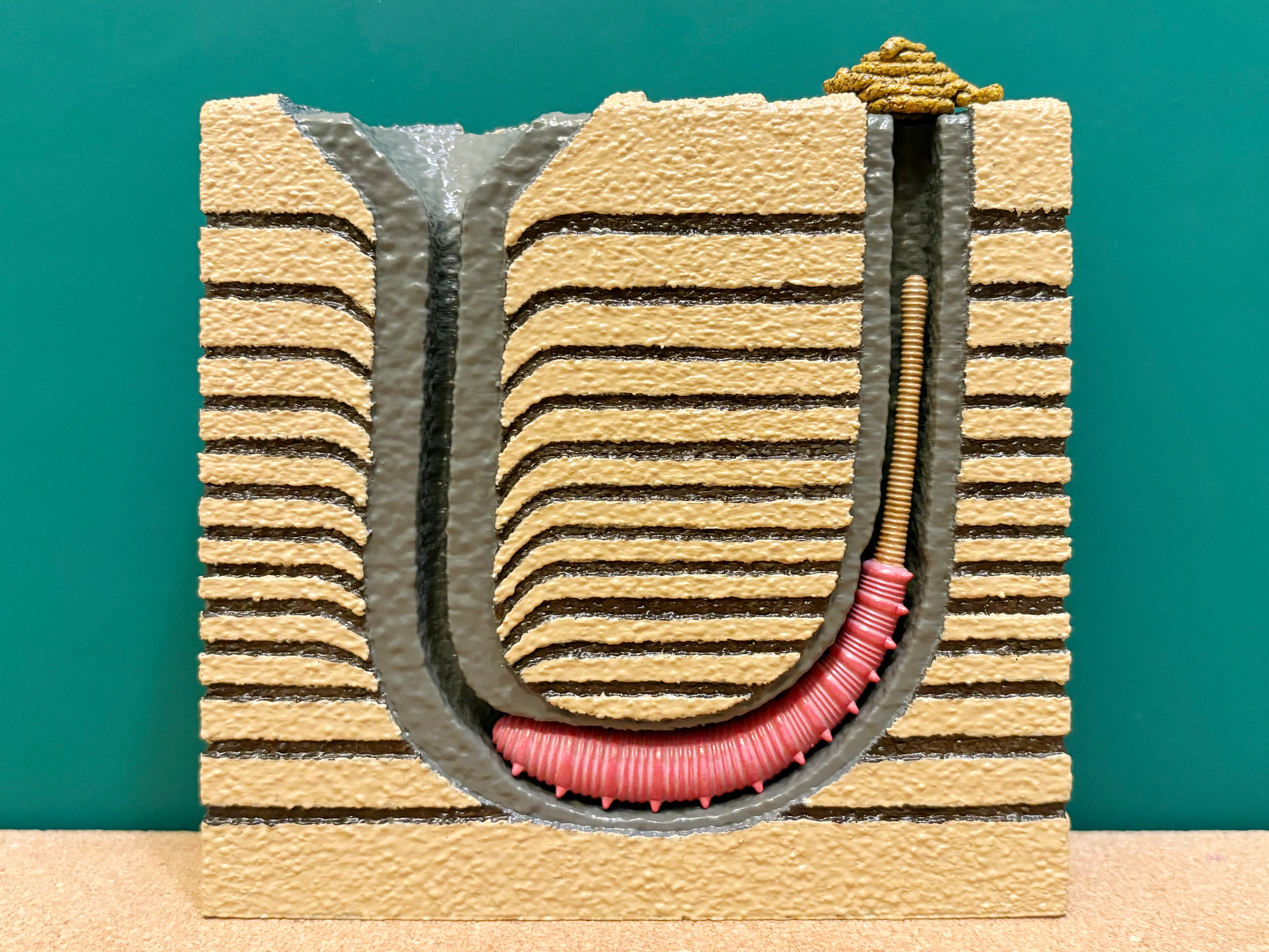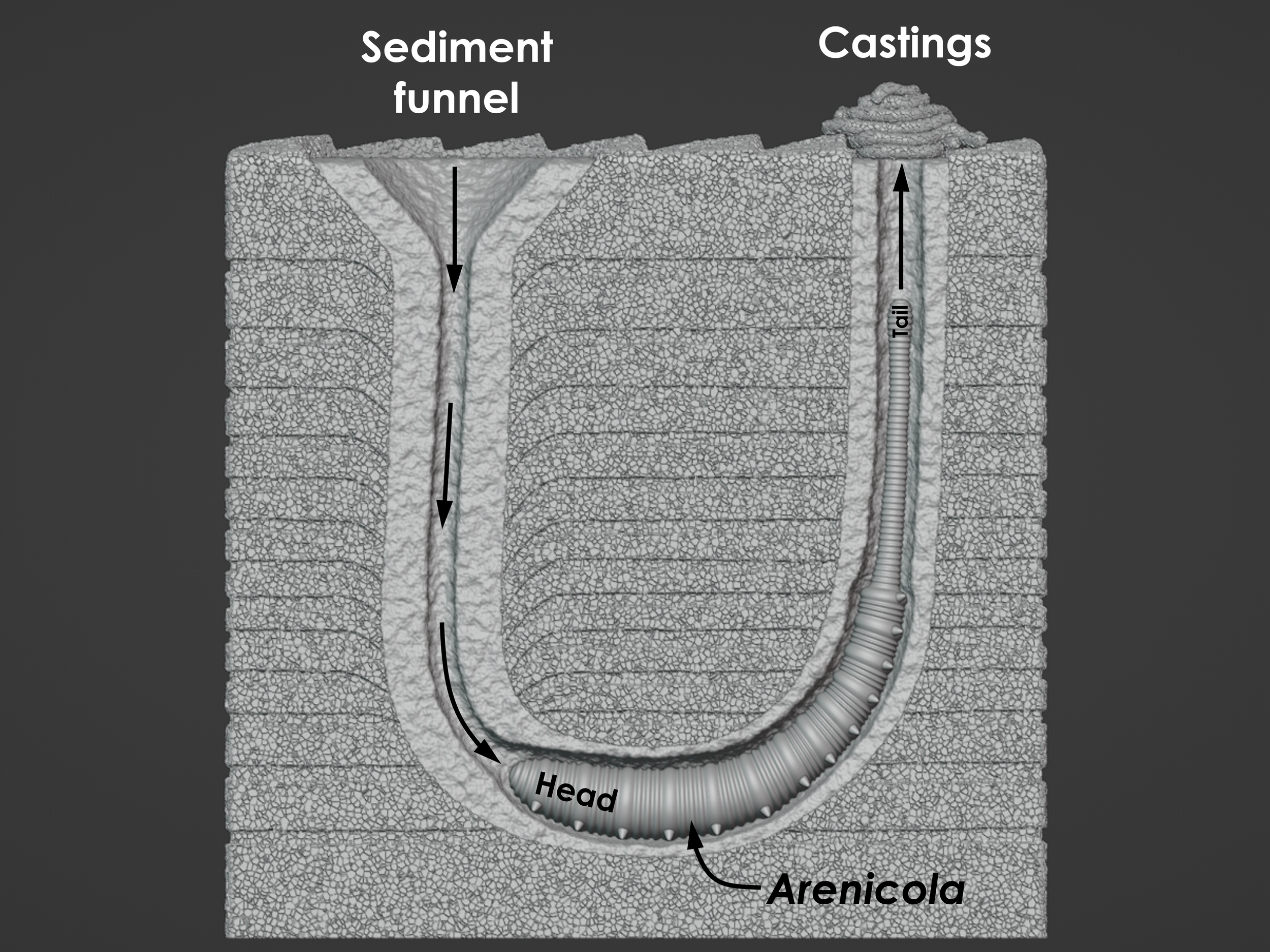 Annelids are segmented worms that belong to the phylum Annelida. A segmented worm is one that is divided into discrete segments or rings like one might find on an earthworm in a garden. Annelid worms can live on land (example: earthworm), and they can also live in the ocean and along shorelines. Earthworms are, of course, well known for their ability to burrow through dirt and to aerate soils. The same is true for marine annelids that live within seafloor mud or shoreline sand. They like to burrow. One common marine annelid is the lugworm Arenicola that produces very distinctive structures through its burrowing activity. When Arenicola finds itself exposed along the surface of a shoreline, it will begin to burrow into the sediment. As it burrows downward, headfirst, it will bore out an L-shaped or J-shaped burrow. The front half of its body occupies the horizontal base of the burrow, and the tail end of its body occupies the vertical column of the burrow that leads back up to the surface. For Arenicola, this burrow is its home, and it doesn’t ever really need to leave. In the fossil record, there is a trace fossil that goes by the name of Arenicolites. The trace fossil Arenicoltes is defined as a U-shaped burrow, and it is obviously named after the lugworm Arenicola. And yet, Arenicola occupies L-shaped and J-shaped burrows. So, what’s going on? Arenicola may occupy an L- or J-shaped burrow, but its activities within the burrow will actually expand the structure into a U-shape that extends well beyond the body of the worm. Arenicola, of course, needs to feed, but its head is found at the dead end of a burrow below the surface of the seafloor. Fortunately, Arenicola is capable of ingesting sand and mud, which it has in abundance right in front of its head and mouth. Arenicola is a deposit feeder, which means that it ingests large quantities of sediment to extract and process the food contained within it. For sand and mud found along a shoreline, Arenicola finds nutritional value in any bacteria, algae, or other microorganisms that might exist among and between the sediment grains that it consumes. Arenicola’s gut is perfectly capable of extracting nutrients from the organic components of the sediment, but what about all the sand and mud that it can’t digest? For this, Arenicola will extend its tail end up the vertical column of the burrow, toward the surface, and excrete the sediment as castings. Castings consist of long, slender piles of sand and mud deposited at the surface opening of the burrow by Arenicola, and they represent the processed sediment that passed through the gut of the worm, was stripped of its nutrients, and excreted as waste at the surface. This casting pile doesn’t grow infinitely. Rather, it’s usually washed away with the tide or with passing waves. As for the U-shaped nature of the burrow, it's a consequence of this same deposit feeding activity. Arenicola can be thought of as a miner, and its relentless extraction of sediment at depth leads to a systematic mine collapse above its head. As Arenicola consumes, digests, and excretes sediment, it produces a void near its head. This void is not stable, and sediment will collapse straight downward toward the head of Arenicola to fill the void and resupply its food source. This sediment collapse takes the shape of a vertical column or tube with a funnel-shaped depression at the surface, like a tiny sinkhole. This continuously collapsing column combines with the horizontal and vertical sections of the occupied burrow to form the full U-shaped trace fossil that we call Arenicolites. This is not to say that all Arenicolites trace fossils in the rock record are produced by lugworms, or even by this behavior, but this is one well-documented behavior that is known to result in U-shaped trace fossils like Arenicolites. Arenicola (the worm) and seafloor block model designed by Scott Mata in Blender v3.6. Arenicola (the worm) was printed on an Elegoo Saturn 3 resin printer using Elegoo ABS-Like Resin. The seafloor block model was printed on a Bambu Lab A1 Mini 3D printer using Sunlu PLA filament.