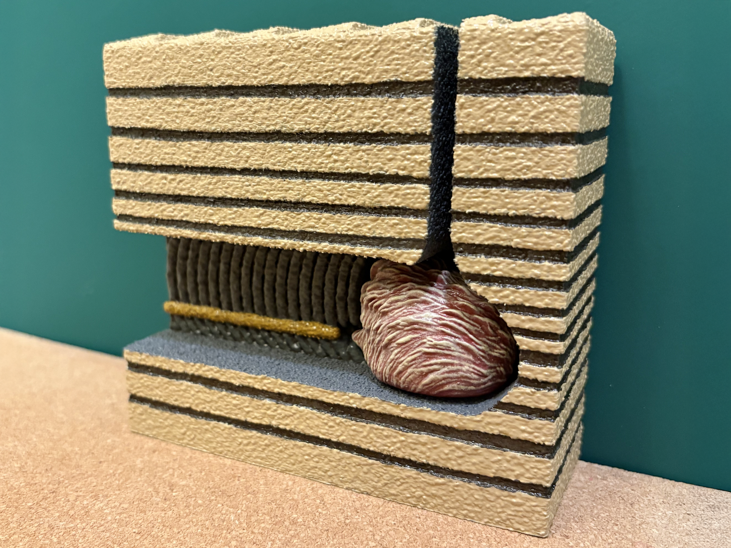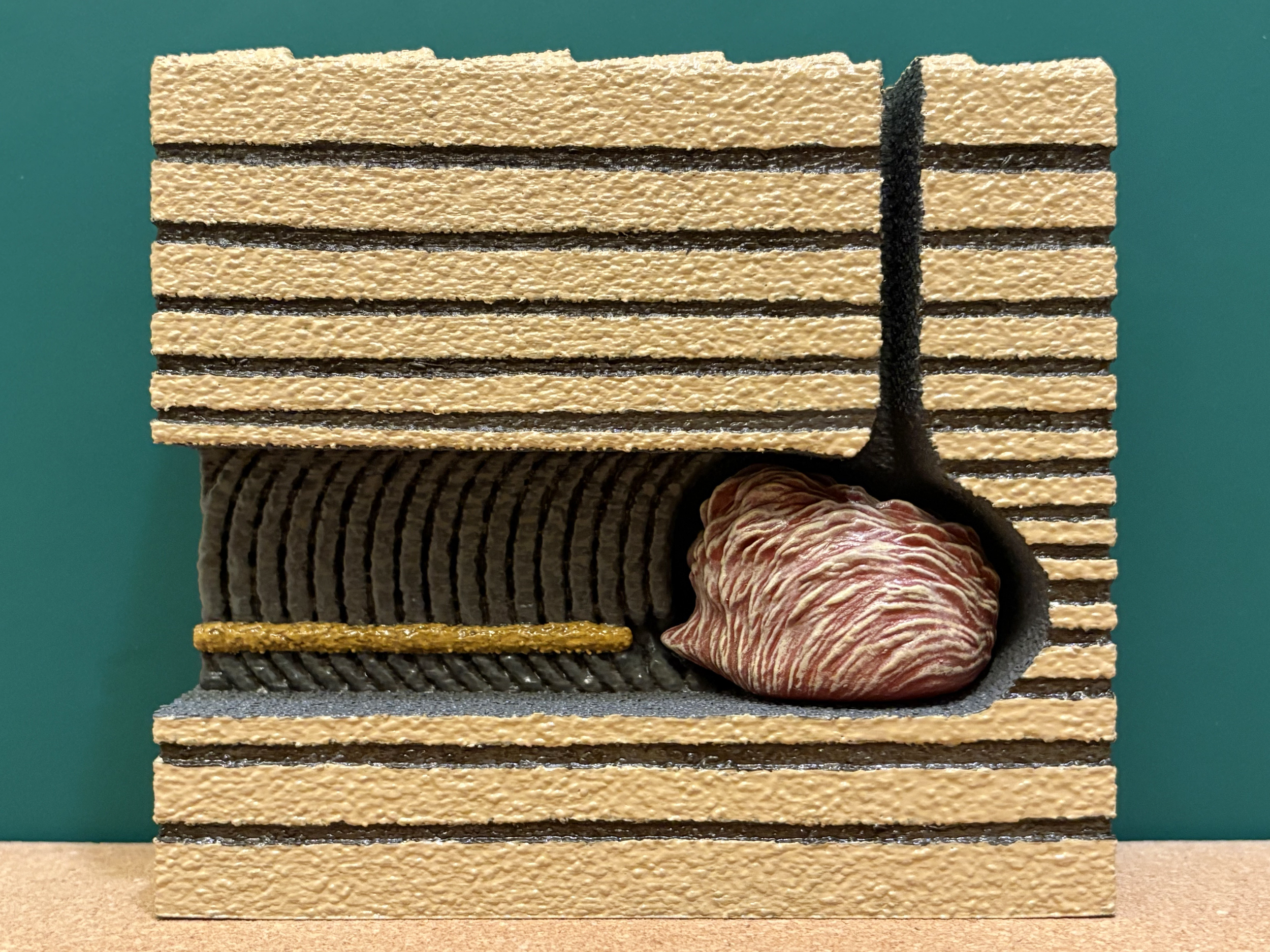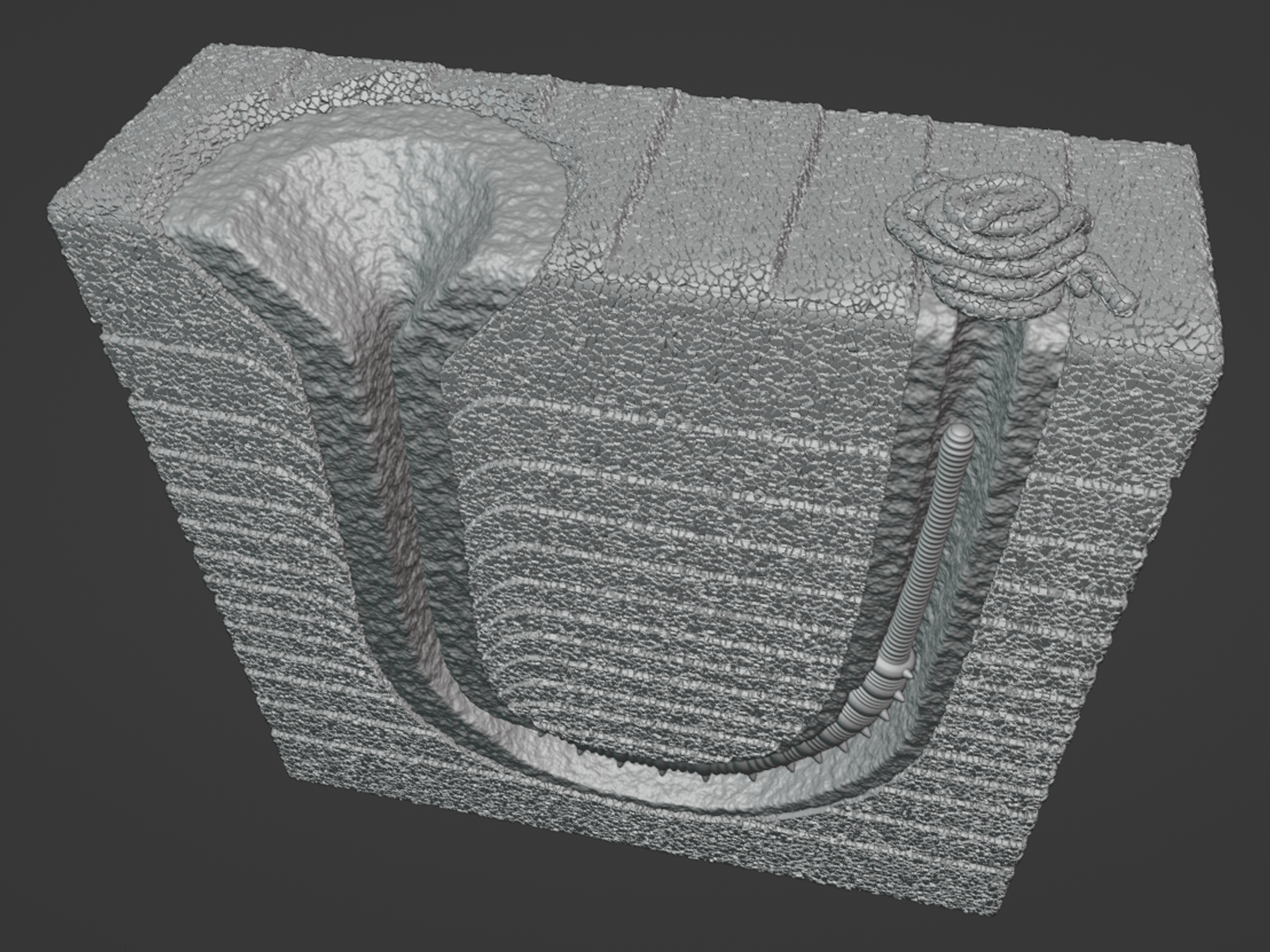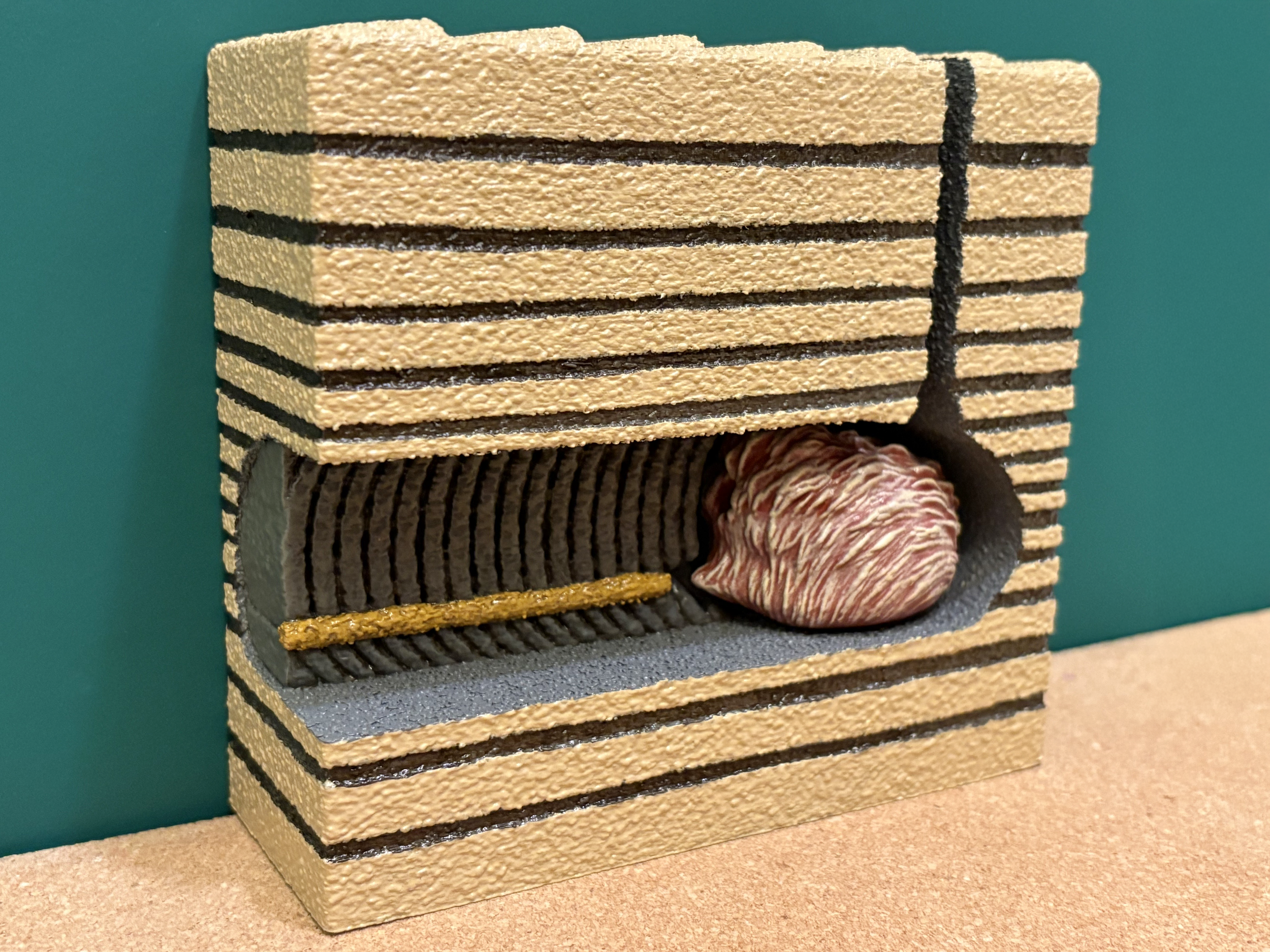 Annelids are segmented worms that belong to the phylum Annelida. A segmented worm is one that is divided into discrete segments or rings like one might find on an earthworm in a garden. Annelid worms can live on land (example: earthworm), and they can also live in the ocean and along shorelines. Earthworms are, of course, well known for their ability to burrow through dirt and to aerate soils. The same is true for marine annelids that live within seafloor mud or shoreline sand. They like to burrow. One common marine annelid is the lugworm Arenicola that produces very distinctive structures through its burrowing activity. When Arenicola finds itself exposed along the surface of a shoreline, it will begin to burrow into the sediment. As it burrows downward, headfirst, it will bore out an L-shaped or J-shaped burrow. The front half of its body occupies the horizontal base of the burrow, and the tail end of its body occupies the vertical column of the burrow that leads back up to the surface. For Arenicola, this burrow is its home, and it doesn’t ever really need to leave. In the fossil record, there is a trace fossil that goes by the name of Arenicolites. The trace fossil Arenicoltes is defined as a U-shaped burrow, and it is obviously named after the lugworm Arenicola. And yet, Arenicola occupies L-shaped and J-shaped burrows. So, what’s going on? Arenicola may occupy an L- or J-shaped burrow, but its activities within the burrow will actually expand the structure into a U-shape that extends well beyond the body of the worm. Arenicola, of course, needs to feed, but its head is found at the dead end of a burrow below the surface of the seafloor. Fortunately, Arenicola is capable of ingesting sand and mud, which it has in abundance right in front of its head and mouth. Arenicola is a deposit feeder, which means that it ingests large quantities of sediment to extract and process the food contained within it. For sand and mud found along a shoreline, Arenicola finds nutritional value in any bacteria, algae, or other microorganisms that might exist among and between the sediment grains that it consumes. Arenicola’s gut is perfectly capable of extracting nutrients from the organic components of the sediment, but what about all the sand and mud that it can’t digest? For this, Arenicola will extend its tail end up the vertical column of the burrow, toward the surface, and excrete the sediment as castings. Castings consist of long, slender piles of sand and mud deposited at the surface opening of the burrow by Arenicola, and they represent the processed sediment that passed through the gut of the worm, was stripped of its nutrients, and excreted as waste at the surface. This casting pile doesn’t grow infinitely. Rather, it’s usually washed away with the tide or with passing waves. As for the U-shaped nature of the burrow, it's a consequence of this same deposit feeding activity. Arenicola can be thought of as a miner, and its relentless extraction of sediment at depth leads to a systematic mine collapse above its head. As Arenicola consumes, digests, and excretes sediment, it produces a void near its head. This void is not stable, and sediment will collapse straight downward toward the head of Arenicola to fill the void and resupply its food source. This sediment collapse takes the shape of a vertical column or tube with a funnel-shaped depression at the surface, like a tiny sinkhole. This continuously collapsing column combines with the horizontal and vertical sections of the occupied burrow to form the full U-shaped trace fossil that we call Arenicolites. This is not to say that all Arenicolites trace fossils in the rock record are produced by lugworms, or even by this behavior, but this is one well-documented behavior that is known to result in U-shaped trace fossils like Arenicolites. Arenicola (the worm) and seafloor block model designed by Scott Mata in Blender v3.6. Arenicola (the worm) was printed on an Elegoo Saturn 3 resin printer using Elegoo ABS-Like Resin. The seafloor block model was printed on a Bambu Lab A1 Mini 3D printer using Sunlu PLA filament.