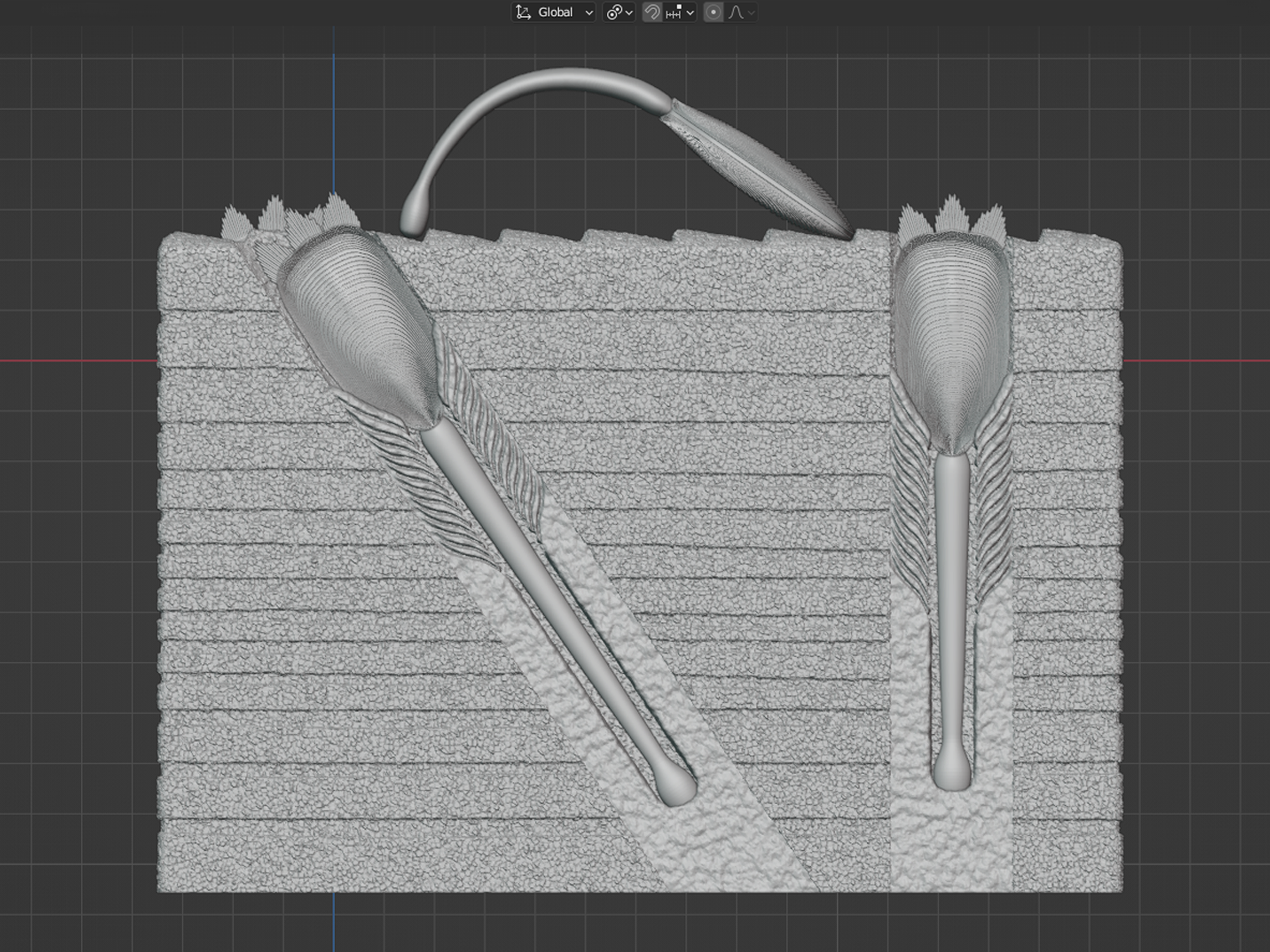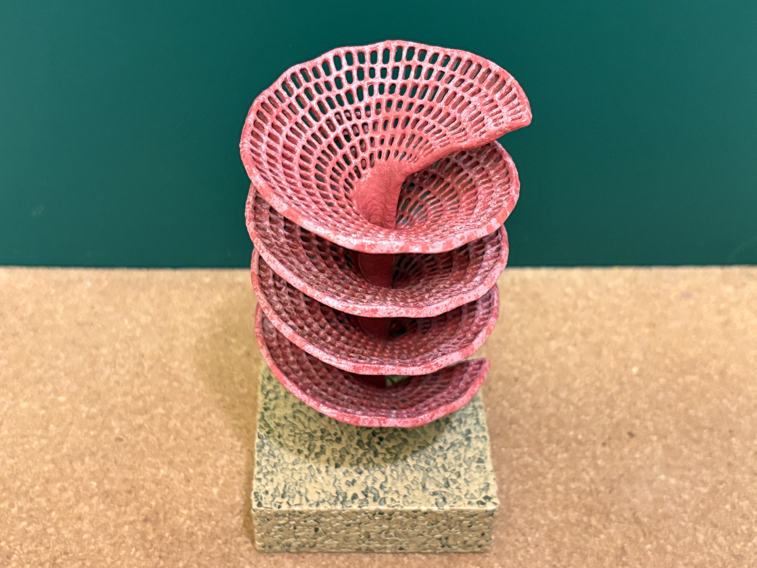 Bryozoans are a group of marine invertebrates known to build a wide range of mineralized structures and skeletons that can superficially resemble those produced by corals. Despite bryozoans and corals both producing mineralized structures, and both being members of reefs at different points in earth’s history, the two groups really aren’t closely related at all. Corals are cnidarians, with close relatives being animals like sea anemones and jellyfish. Bryozoans are lophophorates, so named because they possess a tentacle-covered feeding organ called a lophophore. The other common animal group with a lophophore would be the brachiopods, and they have their own superficiality with bivalve mollusks like clams. Even though bryozoans form sizeable structures that can be part of even larger reefs, the actual animals living within the structure are in fact much smaller. A single, solitary, bryozoan animal called a zooid is often only about 0.5 mm in size, and a mineralized bryozoan skeleton many house hundreds, if not thousands, of these zooids. When bryozoans are preserved in the fossil record, they often resemble a meshwork filled with hundreds to thousands of holes. This is because the soft-bodied zooids were lost to decay during preservation, leaving behind a mineralized skeleton filled with holes for every single zooid that had lived within the structure. So, the fossil record of bryozoans is one of small and large mineralized skeletal structures that contain hundreds to thousands of small (approximately 0.5 mm) holes representing the former presence of soft-bodied zooids. These structures can take many forms, including domes, branching forms, and flat encrustations on hard surfaces. One unique form belongs to that of the fenestrate bryozoans. Fenestra (as in fenestrate) is Latin for window. Fenestrate bryozoans often resemble thin, fan-like sheets filled with holes (windows) that pass all the way through their structure, producing a mesh-like appearance. One even more unique member of the fenestrate bryozoans was the genus Archimedes that lived during the Carboniferous and Permian Periods (approximately 350 million to 250 million years ago). Archimedes takes its name from the mathematician Archimedes that first described the use of screw pumps in ancient Egypt over 2000 years ago. Screw pumps are used for pumping water, and similar pumps—albeit modernized—are still used today. Archimedes, the bryozoan, takes the form of a screw at its core. Around this core, fan-like sheets of fenestrate mineralized skeleton spiral upward, following the path of the screw. Unfortunately, this type of spiral structure does not preserve well in the fossil record. Rather, what is often preserved is the screw-shaped core in isolation that is far more structurally stable. If the spiraling sheets are preserved in association, they are usually broken off and shattered to pieces, so finding an Archimedes bryozoan in life position, or even whole for that matter, is incredibly rare. The best we can do is reconstruct Archimedes based on the information we have, putting the pieces back together again into a single spiral structure around a screw-shaped core, and that is what is shown in this 3D model below with Archimedes rooted into the seafloor. This 3D model can be repeated upward to just about any height a 3D printer can handle. The major limitations are the tightness of the spiral and the size of the holes. If the spirals are any closer than they currently are in the model, it’s nearly impossible to reach inside to clean, sand, prime, paint, or varnish. If the holes are any smaller, at the current printable scale of the model, it’s nearly impossible to keep them from being clogged by resin, primer, paint, or varnish. So, as a digital 3D model, the spiral could be much tighter, and the holes could be much smaller, but neither would be practical for a model that is going to be 3D printed, cleaned, primed, painted, and varnished. Archimedes 3D model designed by Scott Mata in Blender v3.6 and printed on an Elegoo Saturn 3 resin printer using Elegoo ABS-Like Resin.