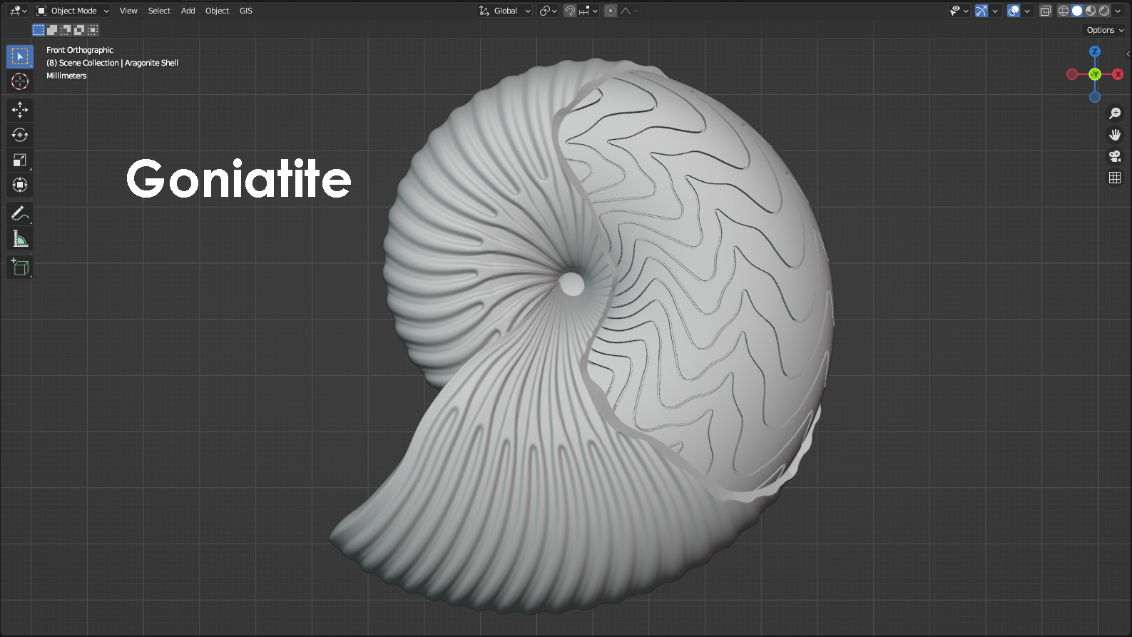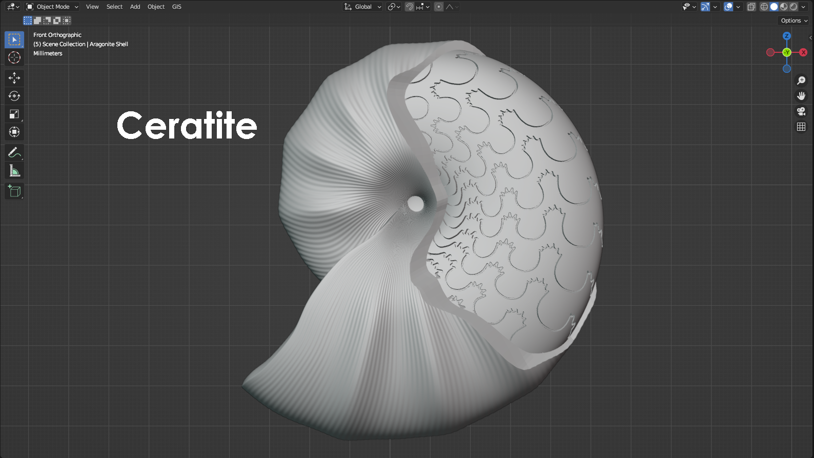Cephalopods are mollusks that have a body organized into a head region that extends down past the mouth into a set of arms and sometimes tentacles. Modern day cephalopods include animals like octopus, squid, cuttlefish, and the chambered Nautilus. Of these listed cephalopods, one is not like the others. That would be the Nautilus. The chambered Nautilus is the only modern cephalopod that has an external mineralized shell. For the Nautilus, the shell is divided into chambers that can be filled with gas and regulated by the Nautilus to adjust the animal’s buoyancy. Adding gas to the internal chambers increases the shell’s buoyancy and allows the Nautilus to rise through the water column, whereas removing gas from the chambers decreases the shell’s buoyancy and allows the Nautilus to sink. Although the presence of an external shell is rare among modern-day cephalopods, that wasn’t the case in the past. In fact, shelled cephalopods are known from up to nearly 500 million years ago, and they only really went into dramatic decline during the Cretaceous-Paleogene mass extinction about 66 million years ago. This is the mass extinction that wiped out the dinosaurs, and it also eliminated many groups of shelled cephalopods. One major group of shelled cephalopods that failed to survive into the modern age is the ammonoids, which includes several different orders. Most notable among them are the goniatites, ceratites, and ammonites. These different orders of ammonoids are distinguished primarily by their “suture patterns” that represent the shape of the walls between chambers inside the shell. When a cephalopod shell is buried within the seafloor, the chambers can fill with sediment or precipitated minerals. Over time, the shell itself can actually dissolve away, leaving behind only the sediment or minerals that filled the interior of the shell. Where the walls between chambers were once located are now recesses that we refer to as “suture patterns” that preserve the shape of the walls, even though the walls are long gone. In the case of the modern Nautilus, the walls between chambers are smooth and gently curved. In the past, with the ammonoids, this wasn’t the case. For the goniatites, the walls between chambers would have been very wavy and, at times, pointed. The smoother, rounded parts of a suture pattern that are convex toward the shell’s opening are referred to as “saddles”, whereas the pointier parts of a suture pattern that are convex away from the shell’s opening are referred to as “lobes”. For the goniatites, the saddles are gently curved, and the lobes are simple, smooth points. For the Ceratites, the saddles are still gently curved, but the lobes consist of hand-like protrusions with small fingers that point away from the shell’s opening. For ammonites, both the saddles and the lobes are complex and contain branching and fractal-like patterns. In terms of complexity, goniatites are considered to have the simplest suture patterns, whereas ammonites are considered to have the most complex suture patterns. Goniatites went extinct during the Permian-Triassic mass extinction (approximately 252 million years ago). Ceratites went extinct during the Triassic-Jurassic mass extinction (approximately 201 million years ago). Ammonites went extinct during the Cretaceous-Paleogene mass extinction (approximately 66 million years ago). The 3D models represented below illustrate these differences between the goniatites, ceratites, and ammonites. Each model has a section of the shell’s outer wall sliced away to reveal what the suture pattern might look like if the ammonoid was preserved as a fossil. For the animal living within the shell, a model was constructed that resembles the anatomy of a modern-day squid with eight arms and two tentacles. A squid tentacle is longer than an arm and terminates in a wide, paddle-like lobe called a “tentacular club”. Tentacles are typically used for ensnaring prey that might be passing by, whereas the arms are used for the more nuanced manipulation of objects. Ammonoid models designed by Scott Mata in Blender v3.6 and printed on an Elegoo Saturn 3 resin printer. Ammonoid shells are printed using Elegoo ABS-Like Resin. The animal itself is printed separately using Elegoo ABS-Like Resin. Although modeled facing left, the ammonoids were mirrored and 3D printed facing right to better show their chronological appearance in the fossil record from goniatites to ceratites to ammonites.
