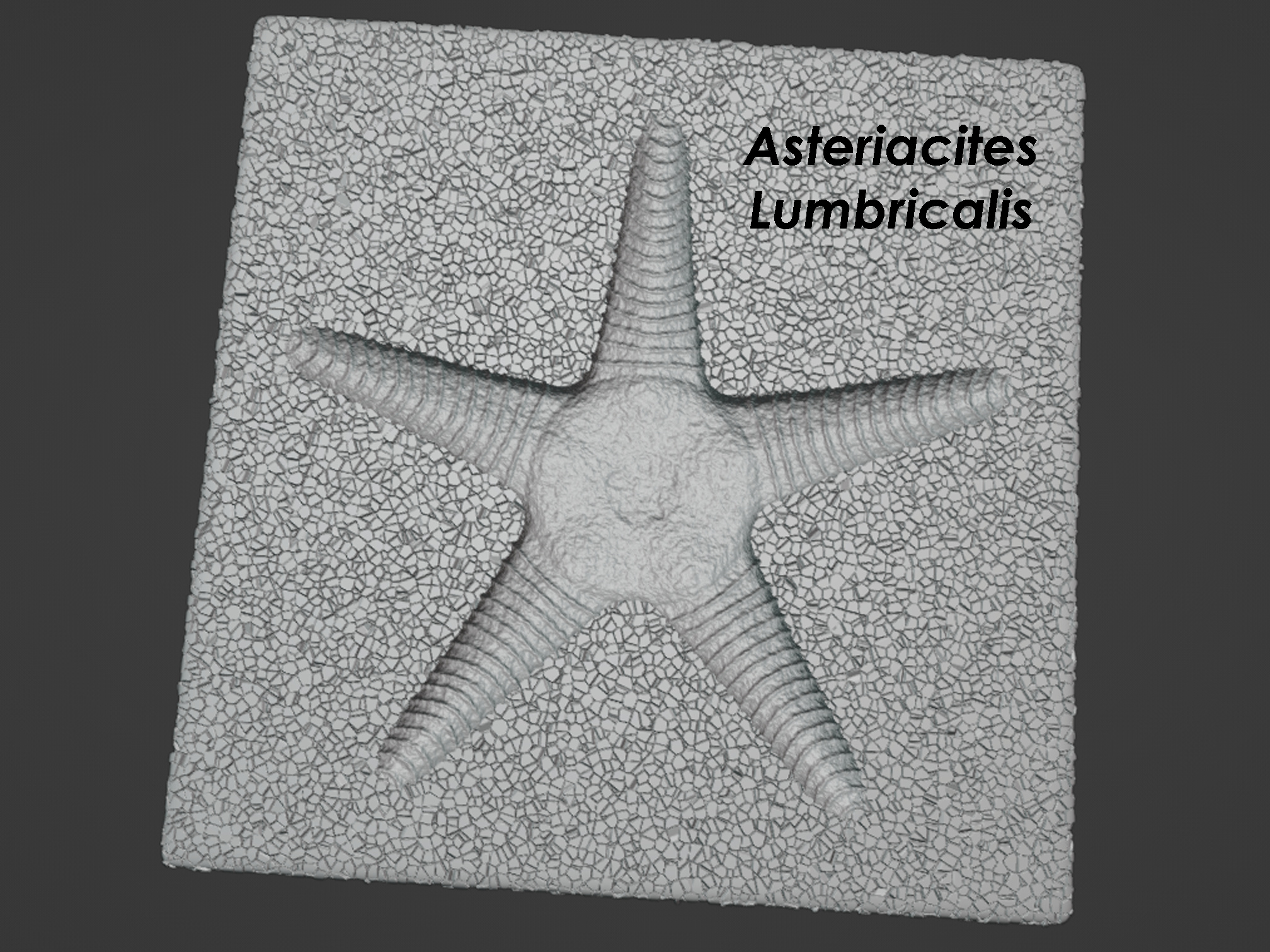 Trace fossils represent fossilized behavior. These behaviors may be preserved in many forms, including common examples like burrows, impressions, trackways, and trails. Much like organisms and fossils can be classified by binomial nomenclature using a genus and a species name, so too can trace fossils. Modern humans are classified as Homo sapiens (genus = Homo; species = sapiens). Where trace fossils differ is that they are classified according to their ichnogenus and ichnospecies because they don’t represent actual organisms. Ichnogenus and ichnospecies only represent behaviors, and there are no broader categories like kingdom, phylum, class, order, or family like we would use for organisms themselves. The oldest valid ichnogenus name is Asteriacites, which was described by E.F. von Schlotheim in 1820. Asteriacites represents a star-shaped impression attributed to a star-shaped organism. In the modern ocean, similar star-shaped impressions can be made by sea stars (starfish) and brittle stars, and ancient examples of the trace fossil Asteriacities are attributed to the resting or burrowing behavior of these two organisms. Sea stars and brittle stars both belong to the subphylum Asterozoa (astero = star; zoa = animal) within the larger phylum of echinodermata (echino = spiny; derm = skin). Echinoderms as a phylum would include sea urchins, sand dollars, sea cucumbers, crinoids and, of course, sea stars and brittle stars. Within the ichnogenus Asteriacites are defined three ichnospecies: Asteriacites lumbricalis, Asteriacites stelliformis, and Asteriacites quinquefolius. Asteriacites lumbricalis is attributed to the burrowing or feeding activity of a brittle star as it buried itself in the seafloor. Brittle stars consist of a central disc-shaped body with five delicate arms that radiate out from this body. This is reflected in the trace fossil Asteriacites lumbricalis, and one of the defining characteristics of this ichnospecies is a distinct central disc impression from which radiates the impressions of five slender arms. Asteriacites stelliformis and Asteriacites quinquefolius lack this central disc impression and consist simply of five radiating arms that meet in the middle. Asteriacites stelliformis and Asteriacites quinquefolius are distinguished from each other based upon the relationship between arm length and arm width. Asteriacites stelliformis has an arm length:width ratio greater than 2:1, which would make it look roughly like the shape of a sea star. Asteriacites quinquefolius has an arm length:width ratio less than 2:1, which would make it look less like a star and more like a pentagon. Asteriacites stelliformis can be made by sea stars and would largely reflect the shape of the sea star’s body. Asteriacites stelliformis can also be made by brittle stars in situations where the brittle star sweeps its arms through the sediment to create an impression far more expansive than its central disc and slender arms would normally produce. This behavior would be similar to how humans can sweep their arms and legs through the snow to produce a snow angel impression far more expansive than a typical human silhouette. Asteriacites quinquefolius is usually attributable to only sea stars and reflects a shallow burial in loose sediment with extensive surface disruption that would produce poorly defined arms and a poorly defined shape in general. In one of the models below, the brittle star Ophiolepis superba, also known as the banded serpent star, is shown producing Asteriacites lumbricalis. As is a fairly common posture for brittle stars, the banded serpent star is shown with its mouth facing downward into the sediment while its arms are raised high up into the water above its body. This is relevant because it illustrates that Asteriacites lumbricalis doesn’t necessarily record the full length of the brittle star’s arms. The length of brittle star arms can vary anywhere between 2 to 20 times the diameter of their central disc, yet most fossils of Asteriacites lumbricalis don’t record such extreme arm lengths, likely because a significant portion of the brittle star’s arms were actually floating in the water during burrowing. In the other model below, the sea star Astropecten articulatus, also known as the royal starfish, is shown producing Asteriacites stelliformis. In this instance, the trace fossil is nearly identical in shape and size to the body of the sea star, and all parts of its body and arms are submerged in the sediment and reflected directly in the trace fossil. Brittle star, sea star, and trace fossil block models designed by Scott Mata in Blender v3.6.