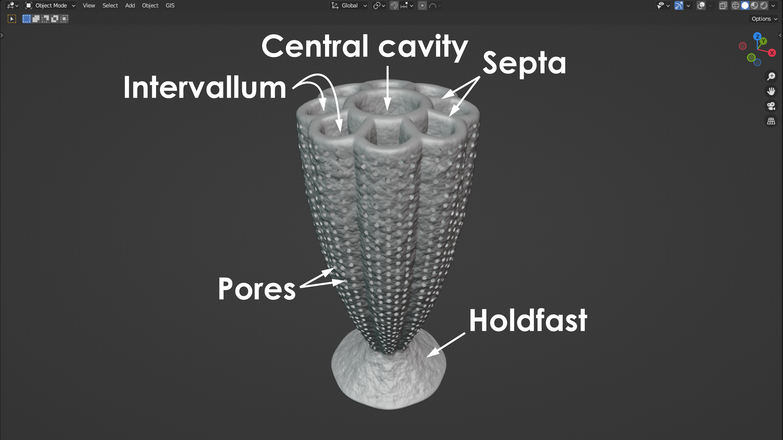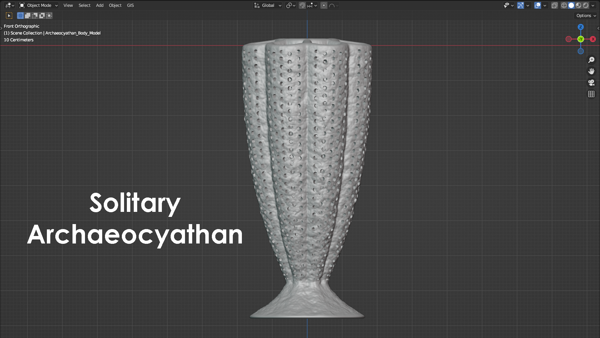 The phylum porifera contains all the sponges that exist today. This includes sponges that live in marine environments and those that live in freshwater environments. Porifera also contains many extinct groups and forms that have existed and since perished over the past 600 or so million years. Sponges are animals that contain a system of pores and canals that allow them to filter water through their bodies and extract food particles from that flowing water. This filtering is how they feed, and many sponges have a shape similar to a chimney to filter this water efficiently. Typically, water is sucked in through the outside wall of the sponge, food is filtered and extracted from the flowing water, and the filtered water is then expelled upward through a vertically oriented, central cavity. During the Cambrian Period (approximately 538-485 million years ago), the most common and most diverse members of the porifera phylum were the archaeocyathans. Some interpretations place archaeocyathans as their own phylum apart from the sponges and the phylum porifera, but modern convention considers them as a taxonomic class within the phylum of porifera. Being a member of porifera would suggest that archaeocyathans share many anatomical characteristics with a typical sponge, and they do. Where archaeocyathans differ from a typical sponge is in the structure of their walls. A typical marine sponge has only a single wall between the outside environment and its central cavity. This means that a typical sponge will filter water through only this single wall before evacuating the filtered water upward and outward into the environment. Archaeocyathans, in contrast, are defined by the presence of two walls (inner and outer) that are arranged into what is often referred to as a nested cone-in-cone structure. One might imagine two tapered ice cream cones nested within each other with a vacant space in between, and this would not be too far off from a typical archaeocyathan’s general anatomy. The space between the outer wall and inner wall of an archaeocyathan is called the intervallum, and this corridor is typically divided into compartments separated by additional walls called septa (plural = septa; singular = septum) that span the gap between the inner wall and outer wall. The presence of two distinct walls, an intervallum, and septa are the key characteristics that are present in all archaeocyathans but are lacking in all other members of the phylum porifera. This is what makes archaeocyathans unique among all other sponges. Beyond their distinctive anatomy, archaeocyathans are also notable for emerging, living, thriving, and then going extinct all within the Cambrian Period. During this time interval, archaeocyathans claimed the title of the first animal reef builders and were responsible for creating a rigid framework within the reefs they built and occupied. This is in contrast to modern reefs where the rigid framework is often produced through a combination of growth primarily from coral and algae. Although archaeocyathans produced many different morphologies, two of the most general forms are referred to as solitary and modular (branching). A solitary archaeocyathan consists of a single cone-in-cone structure attached to the seafloor with some sort of holdfast or anchor. Modular archaeocyathans consist of two or more cone-in-cone structures that branch off from a single, central holdfast or anchor. In this regard, modular archaeocyathans can resemble branching colonial corals in their broad form, although neither would really be mistaken for the other upon close inspection. The 3D models shown below represent a very generalized version of a solitary archaeocyathan and of a modular archaeocyathan. The solitary archaeocyathan was inspired by Archaeocyathellus from the Treatise on Invertebrate Paleontology Part E [Fig. 3, p. E4]. The modular archaeocyathan was inspired by the framework-building, branching archaeocyathans documented within the Poleta Formation of Nevada by Rowland (1984) [Geology, v. 12, p. 181-183]. Archaeocyathan models designed by Scott Mata in Blender v3.6 and printed on a Bambu Lab A1 Mini 3D printer using Sunlu PLA filament.