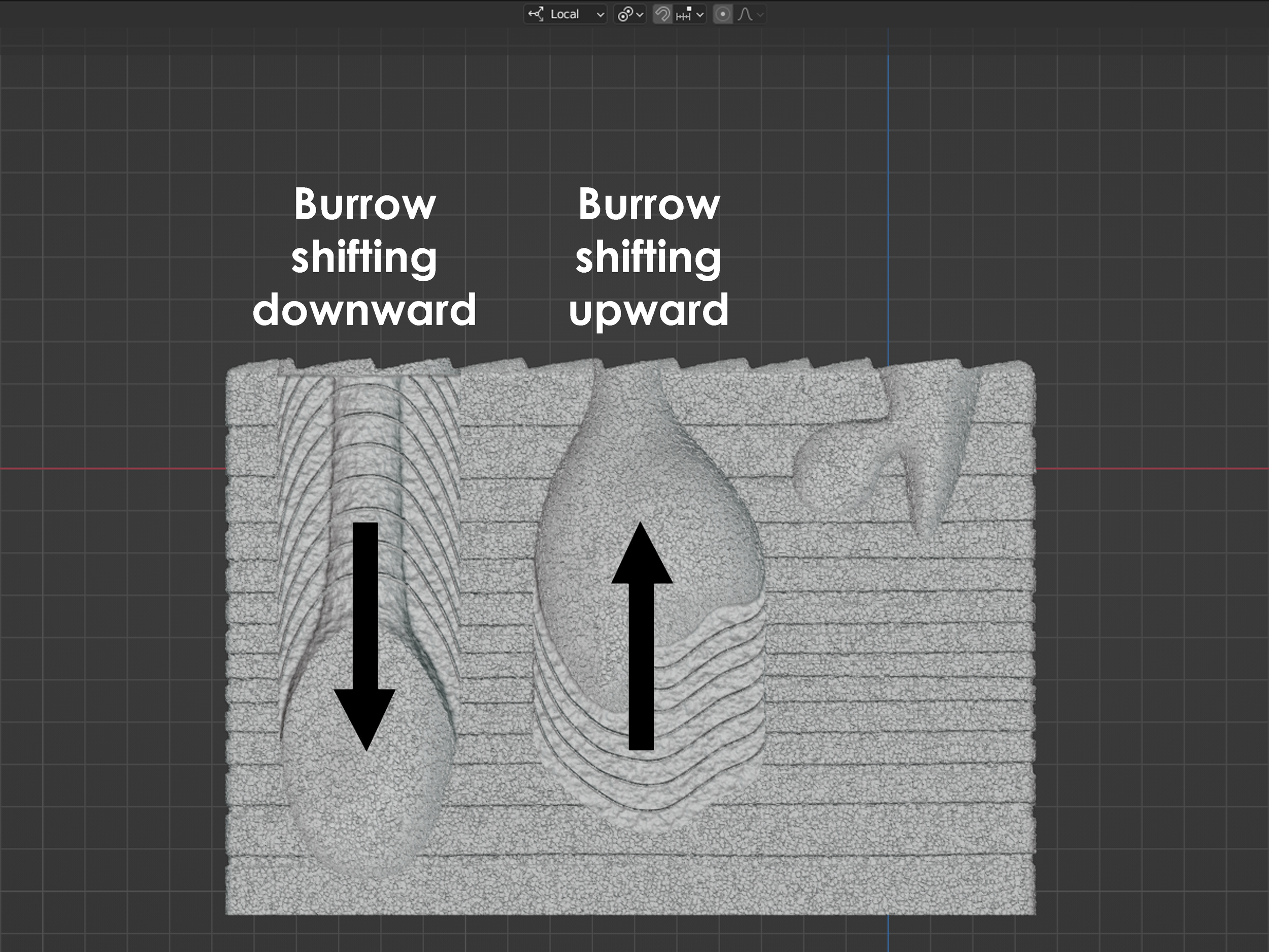 Among animals, the phylum lophophorata had particular prominence in Earth’s ancient oceans (primarily during the Paleozoic Era) but has since become far less common, especially in the modern ocean. Members of the phylum are referred to as lophophorates because they use a tentacle-covered feeding appendage called a “lophophore”. Among the lophophorates are the brachiopods, and these brachiopods can, at times, superficially resemble bivalve mollusks like clams, oysters, and mussels. This superficial resemblance stems from the fact that both groups of animals, bivalves and brachiopods, have a two-part (two-valve) shell that typically hinges and can swing open and closed as needed for feeding and breathing. Brachiopods are considered either articulate (articulated = hinged) or inarticulate. Articulate brachiopods have a two-part shell that is capable of swinging open and closed along a hinge line. This is similar to how bivalves operate. In contrast, inarticulate brachiopods have no hinge at all and are simply not capable of swinging their shell open or closed in that way. Rather, inarticulate brachiopods use muscles to hold the two halves of their shell together without any meaningful hinged connection. What inarticulate brachiopods lack in articulation, they make up for in their ability to burrow. Both articulate and inarticulate brachiopods have a long external (outside the shell) fleshy extension of their body that is called a pedicle. In articulate brachiopods, the pedicle is used to anchor the shell to firm or hard surfaces at the seafloor’s surface. After the shell is anchored, an articulate brachiopod tends to live a stationary existence and doesn’t typically doesn’t change locations, at least not willingly. For inarticulate brachiopods, the pedicle is used for burrowing and mobility. An inarticulate brachiopod can “walk” across the seafloor using the front of its shell and the end of its pedicle in a sort of arched, worm-like motion. The pedicle is also used for anchoring and adjusting an inarticulate brachiopod within a subsurface burrow. Inarticulate brachiopods are known to burrow down into the sediment by leading with the front edge of their shell as their pedicle trails behind them. They accomplish this by using a scissor-like motion of the two valves of their shell to sweep and transport sediment away from their leading edge. Following a u-shaped trajectory, the brachiopod will burrow downward before emerging back upward near the seafloor surface with its pedicle pointing down and the front edge of the shell facing up. In this position, the pedicle serves as an anchor and can push up or pull down the brachiopod’s shell and body to keep it at the seafloor’s surface for feeding. These up and down adjustments of the shell and body are often recorded as downward deflected sediment layers within the burrow, just beneath the brachiopod’s shell. The deflected layers themselves reflect a combination of sedimentation within the burrow, filling-in beneath the shell, as well as actual physical disruption due to up and down shell movement. The inarticulate brachiopod burrowing behavior and seafloor block model shown below were heavily inspired by Zonneveld et al. (2007) [PALAIOS, v. 22, p. 74-97], which was supported by previous work by Thayer and Steele-Petrovic (1975) [Lethaia, v. 8. P. 209-221] and Emig et al. (1978) [Geobios, v. 11, p. 573-609]. The 3D model demonstrates some of the common burrowing styles of inarticulate brachiopods, as well as the movement of an inarticulate brachiopod across the seafloor before beginning its burrowing descent. Inarticulate brachiopods and seafloor block model designed by Scott Mata in Blender v3.6. Inarticulate brachiopods were printed on an Elegoo Saturn 3 resin printer using Elegoo ABS-Like Resin. The seafloor block model was printed on a Bambu Lab A1 Mini 3D printer using Sunlu PLA filament.
