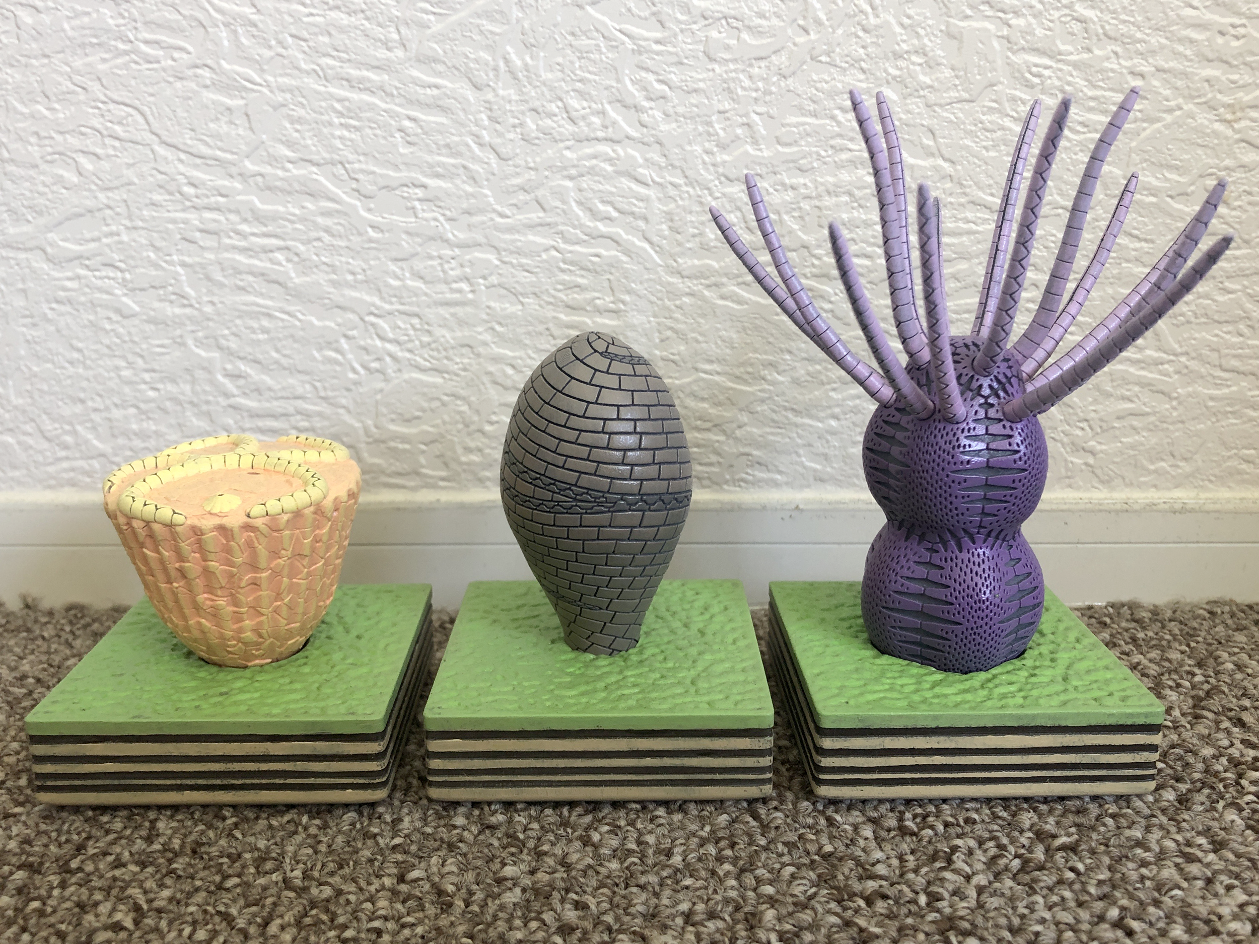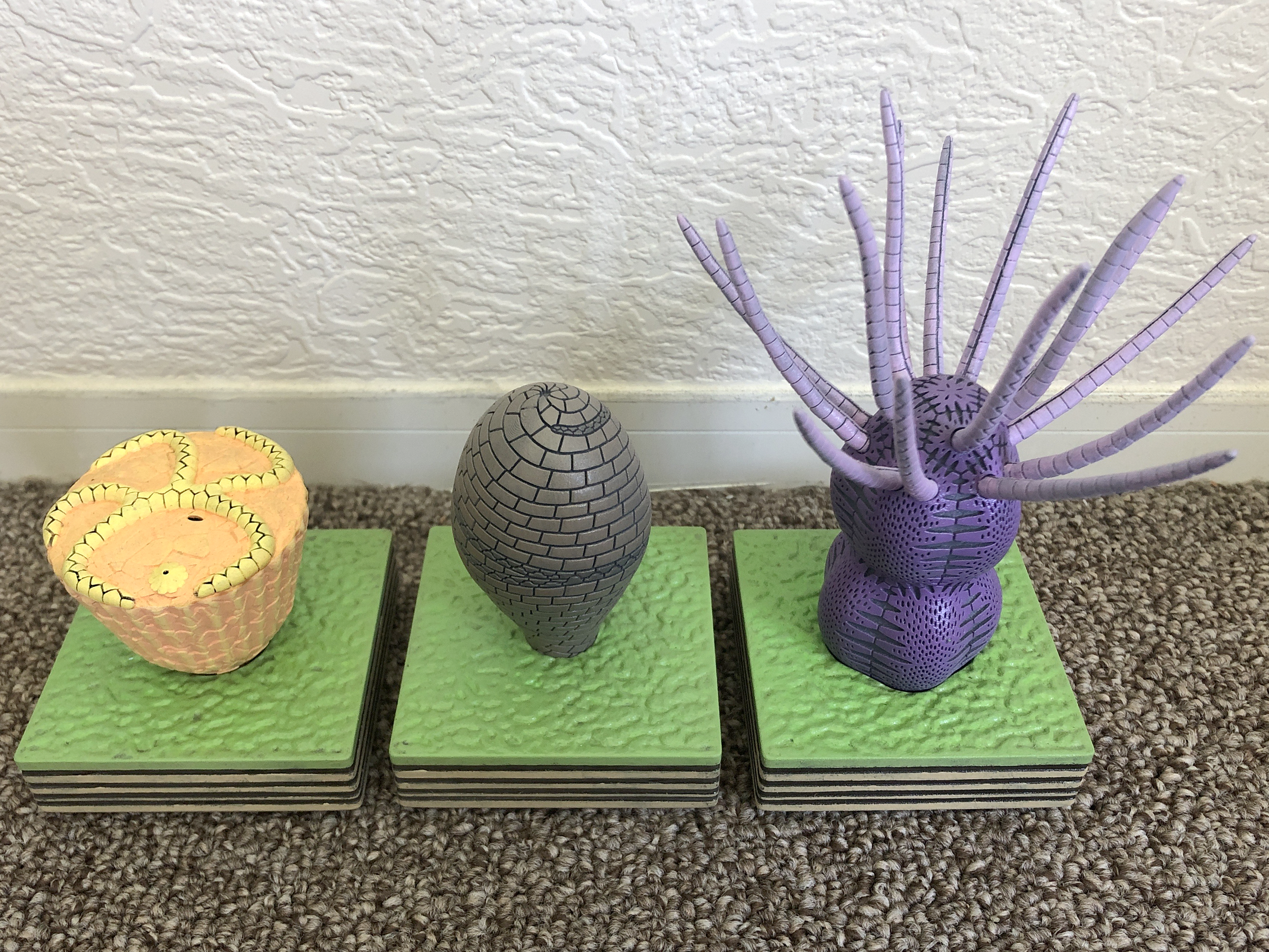This set of 3D printed models represents three varieties of echinoderms that lived during the early Cambrian Period and reflect lifestyles that became scarce following the Cambrian substrate revolution as per Bottjer et al. (2000) [GSA Today, v. 10, p. 1-7]. As is described on the 3D animations section of this website for the videos on “Helicoplacoids and the Cambrian seafloor”, “Edrioasteroids and the Cambrian substrate revolution”, and “Adaptation and attachment in early Paleozoic crinoids and eocrinoids”, the Cambrian Period is a time of transition for the seafloor. With the radiation of burrowing organisms, there was a fundamental shift from firm microbial mat-covered seafloors to thoroughly burrowed, water-saturated, soupy seafloors. This shift was problematic for many organisms that had evolved and had built an ecological lifestyle around embedding themselves in a firm seafloor, similar to how a golf tee might embed itself within firm grass. This firmness of the seafloor was a consequence of a general lack of deep burrowing and was, of course, aided by the presence of microbial mats in certain environments to further bind the seafloor. These three echinoderms—Camptostroma, Helicoplacus, and Lichenoides—reflect this lifestyle that is referred to as a sediment sticker (for sticking in firm sediment) or mat sticker (for sticking in microbial mat-bound sediment). Camptostroma is an edrioasteroid that would have lived embedded within a firm seafloor as a sediment sticker or a mat sticker with its pointed lower end stuck straight down into the seafloor. Following the Cambrian substrate revolution, edrioasteroids would adapt to the changing seafloor by flattening and becoming encrusters that would glue their suction cup-like bodies to hard surfaces like the shells of other organisms. Helicoplacus is a helicoplacoid, which is a group of echinoderms known only from the Cambrian Period. Unlike other echinoderms that are known for their five-fold symmetry and can be divided five ways like a sea star, helicoplacoids have three-fold symmetry that can be seen in the three branches of plates that radiate out from the center of their body. Helicoplacoids would have been sediment stickers or mat stickers similar to Camptostroma, and their narrow end would have been embedded into a firm seafloor so that they could stand upright. Following the Cambrian substrate revolution, helicoplacoids seemingly couldn’t adapt to the new softer seafloor and simply went extinct as a group. Lichenoides is an eocrinoid that had a bulbous body divided into somewhat large plates relative to its body size, and these plates are connected with equally large sutures. The lower end of Lichenoides is very round, as compared to Camptostroma and Helicoplacus, and it has 15 arms that radiate outward from the top of its body. Later eocrinoids developed stems and holdfasts that would help them to either root themselves into a soft seafloor or affix themselves to hard surfaces like the shells of other organisms. Lichenoides has no stem and no holdfast, and it’s therefore likely that it rested directly on the seafloor with no particular method of attachment other than possibly embedding itself within a firm seafloor. All three echinoderm models are resting on square bases that allow them to sit upright in their life position. These bases represent the nature of the seafloor that these organisms would have inhabited. The side of the base shows parallel layers of sediment within the seafloor that reflect a lack of burrowing. The top of each base contains a wrinkled surface that is suggestive of the sedimentary structure called “wrinkle structures” that forms in the presence of a seafloor microbial mat. Camptostroma, Helicoplacus, and Lichenoides models designed by Scott Mata in Blender v3.6 and printed on an Elegoo Saturn 3 resin printer. All models are printed using Elegoo ABS-Like Resin except for the arms of Lichenoides that are printed separately using Anycubic Tough Resin for added flexibility.